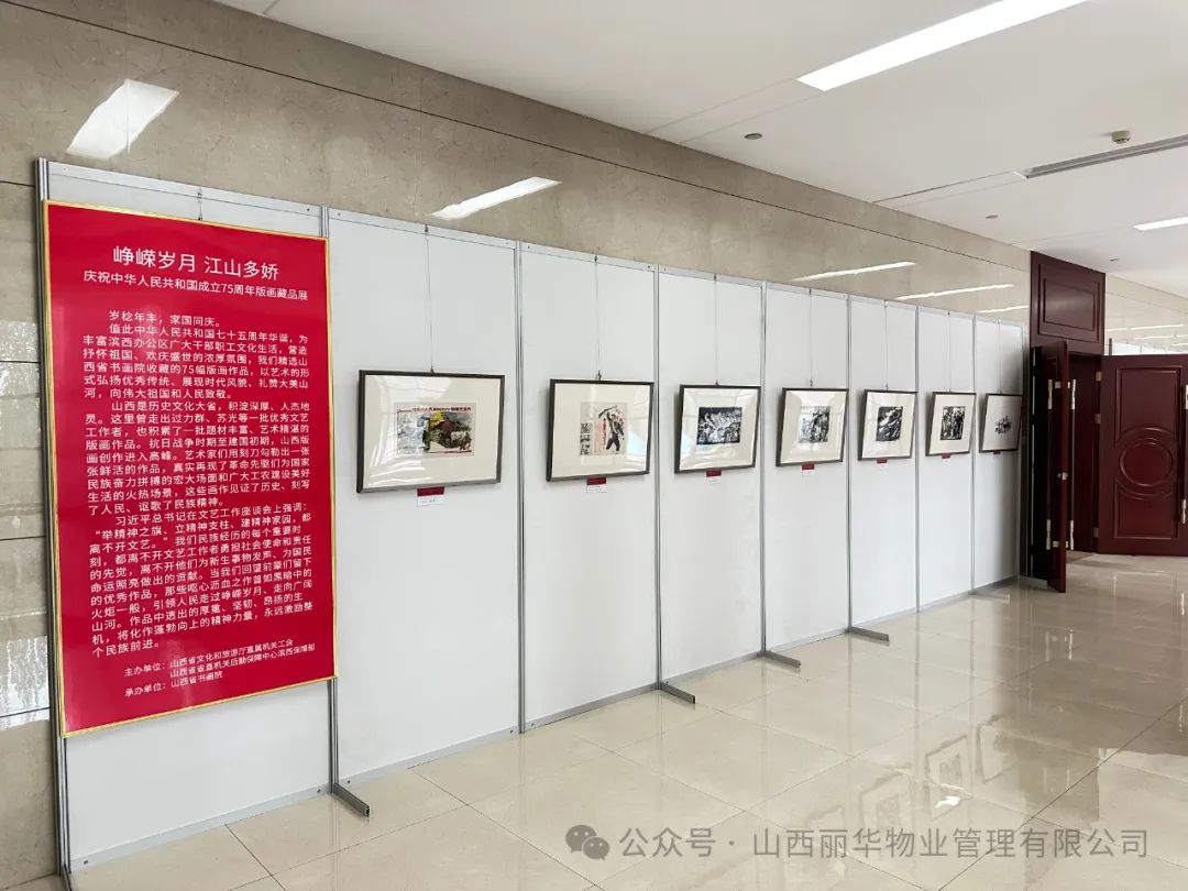 為豐富濱西集中辦公區(qū)廣大干部職工文化生活,營(yíng)造抒懷祖國(guó)、歡慶盛世的濃厚氛圍,由山西省書(shū)畫(huà)院承辦、麗華物業(yè)協(xié)辦的“歲月崢嶸 江山多嬌”專題版畫(huà)藏品展在辦公區(qū)二、三層餐廳走廊展出,以藝術(shù)的形式弘揚(yáng)優(yōu)秀傳統(tǒng)、展現(xiàn)時(shí)代風(fēng)貌、禮贊大美山河,向偉大祖國(guó)和人民致敬。